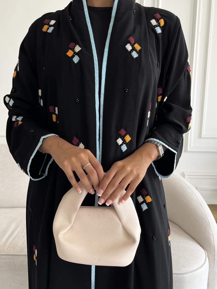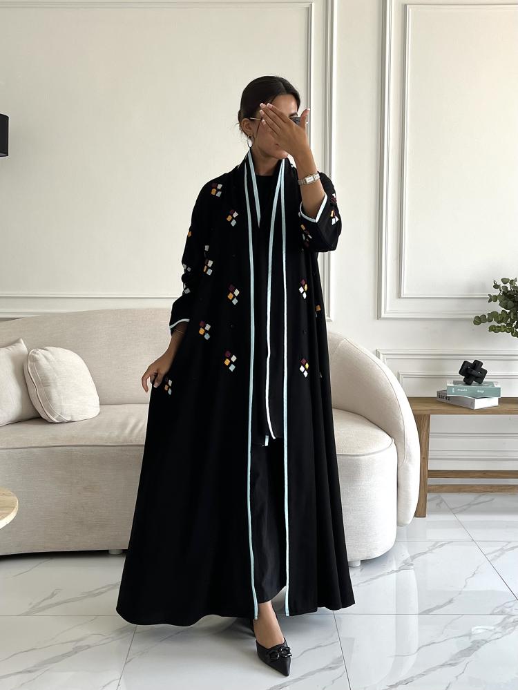 - شكلها يلفت الانتباه بتطريز الألوان المتعددة اللي تغطي العباية كاملة.