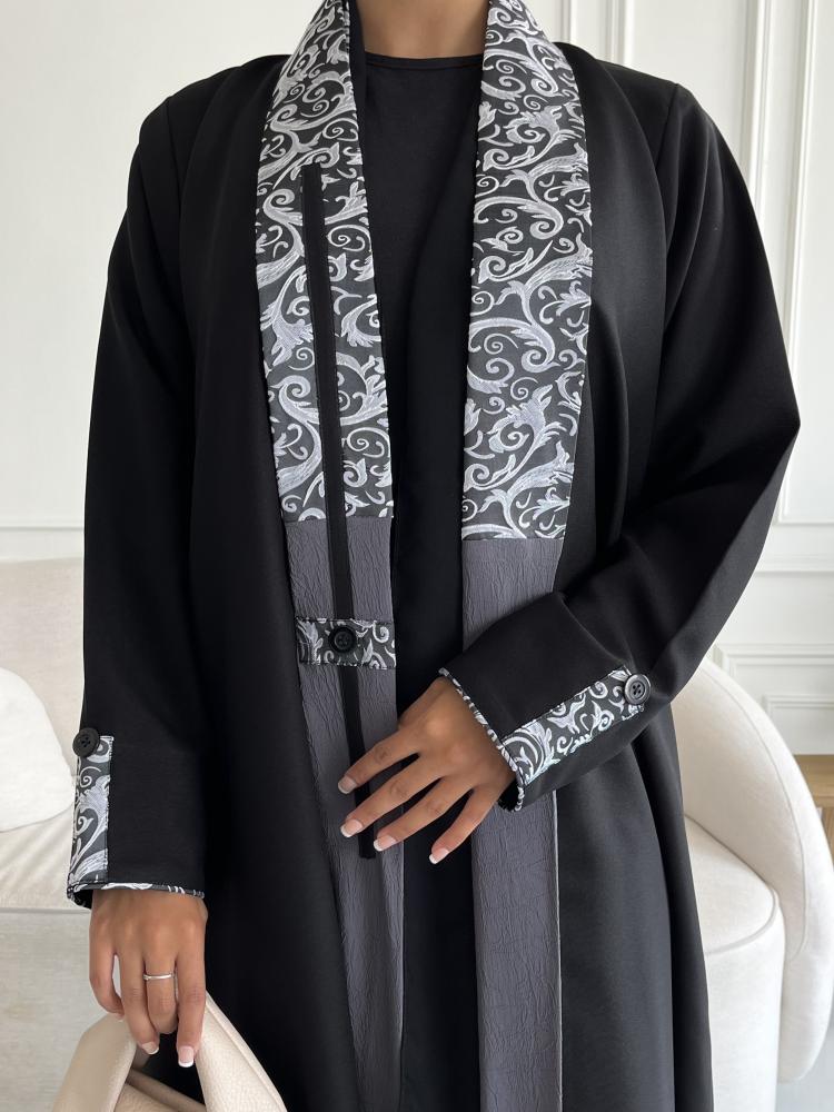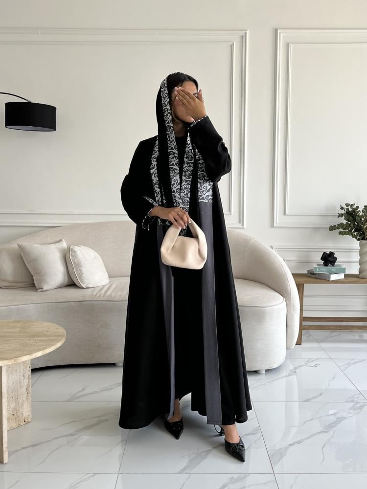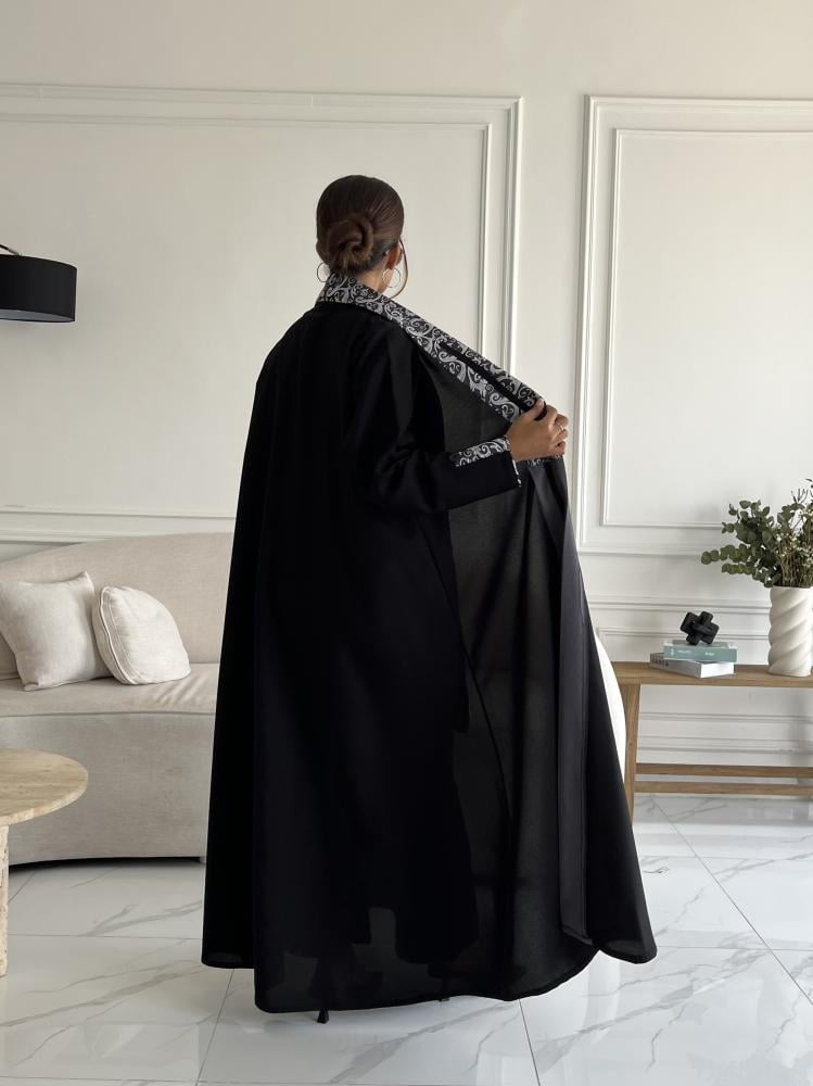 عباية نص كلوش ,مفتوحة سوداء بتطريز أبيض ورمادي مميز على الياقة والأكمام تمنحك لمسة أنثوية رقيقة بتدفقها حولك كلما تتحركين حيث أنها مصنوعة من قماش كريب خفيف وعالي الجودة، تصميمها الكلاسيكي الراقي يجعلها خيار مثالي للمناسبات الخاصة والرسمية لتتمتعي بإطلالة أنيقة وفاخرة تليق بك.